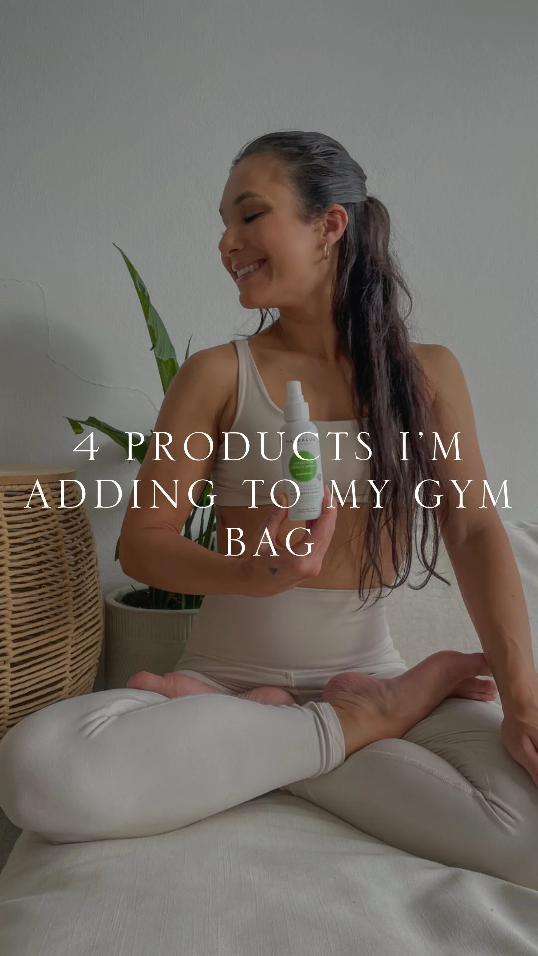 A smiling woman in a black sports bra outdoors with trees and plants in the background. There is a circular logo with text around it in the lower right corner.