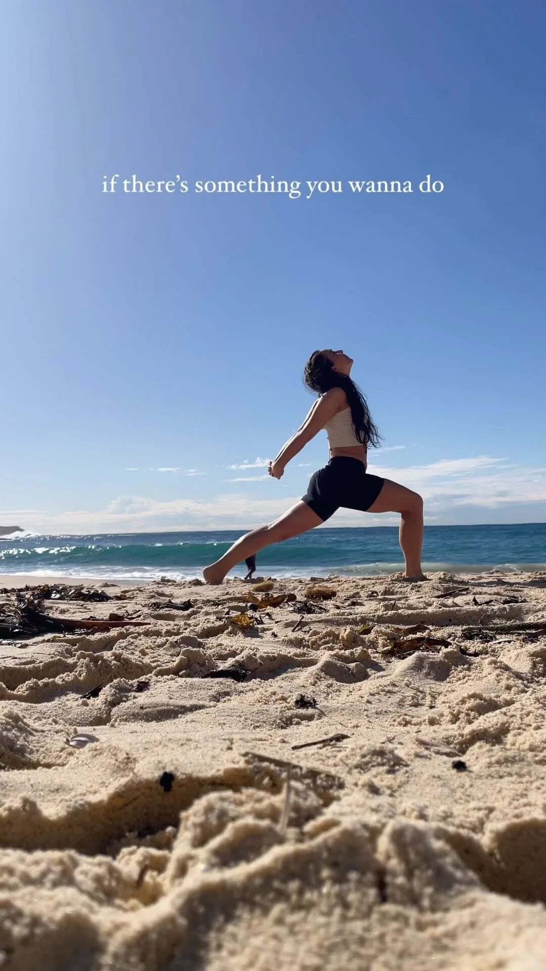 Woman practicing yoga on rocks by the beach during sunset with a pink salt crystal nearby.